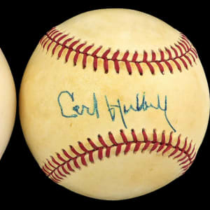 “Leo the Lip” and “King Carl,” Hall of Fame manager Leo Durocher, and Hall of Fame pitcher Carl Hubbell, are the subjects of these (2) single-signed baseballs.