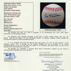 Leo Durocher has applied a bold (“9”) ballpoint signature to a white ONL/White ball. The ball comes with a Full LOA from James Spence/JSA.