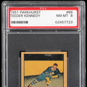 Graded NM-MT 8 by PSA. The rookie card of New York Rangers Hall of Fame centre Theodore "Teeder" Kennedy. A high-grade Parkie that ranks in the upper 9% of all similar copies evaluated by the grading service.