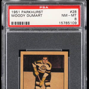Graded NM-MT 8 by PSA. Put your 1951 Parkhurst Hockey collection to bed by scoring this high-grade #28 Woody Dumart rookie card. Boston Bruins Hall of Famer.