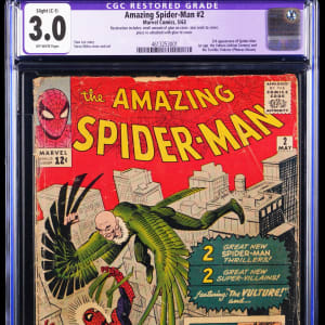 A strange bird gets his feathers plucked in this 5/63 Marvel Amazing Spider-Man #2 issue. Winged nightmare the Vulture made his first appearance in this Silver Age thriller, which also saw high schooler Peter Parker/Spider-Man take on the Terrible Tinkerer, also making his debut in this early Spidey comic. A fresh-faced hero battling two new super-villains makes this vintage comic a classic, and really, all early Amazing Spider-Man issues pack a lot of collecting clout. So make sure you're in on the action for this ASM #2 issue, which is CGC graded 3.0, Off-White Pages, Restored Slight C-1. Label notes are "Piece re-attached with glue to cover. Restoration includes: small amount of glue on cover, tear seals to cover. Stan Lee story, Steve Ditko cover and art. 3rd appearance of Spider-Man. 1st app. the Vulture (Adrian Toomes) and the Terrible Tinkerer (Phineas Mason)."