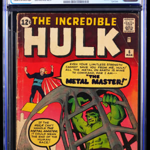 The original Incredible Hulk 6-issue run came to a crashing halt with this #6 issue, published with a date of 3/63. By no means was this the end for Marvel's mega-popular green monster. This fan favorite super-hero soon showed up in The Avengers, Tales to Astonish, and a number of guest appearances, before continuing his solo adventures with the return of The Incredible Hulk title in 1968. Make a welcome addition to your collection by adding this recently graded example, which has earned a favorable (4.0, Cream to Off-White Pages) rating from CGC. Label notes are "Stan Lee story, Steve Ditko cover and art. 1st appearance of the Teen Brigade and the Metal Master. Last issue.".