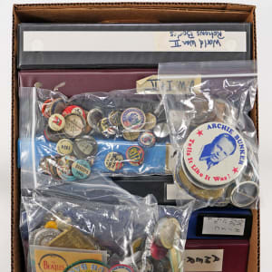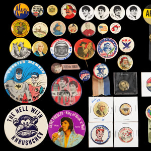 Dive headlong into a celebration of pop culture, the military, and more, with this 20th Century pin and trinket hoard (500+). Packed into this vast selection, are pins, badges, medals, coins, tokens, tools, pocketknives, and strange devices we don’t recognize. In a minority share, you will also find photographs, postcards, and assorted ephemera, though the bulk of this collection are metal items. Many popular characters and themes are represented, including WWII, General MacArthur, George Washington, The Beatles, Elvis, Popeye, Dick Tracy, Howdy Doody, Batman, Archie, John Glenn, Abraham Lincoln, Aunt Jemima, Roy Rogers, Hopalong Cassidy, Santa Claus, and much more. Condition is generally satisfying, with the great majority showing light to moderate age-appropriate wear, though a small number are well-worn, while some of the most recent items present as like-new.
