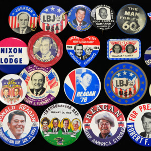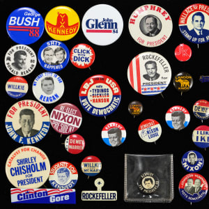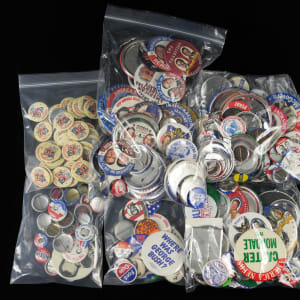 From the savage wilds of the campaign trail, comes this 1930s-2010s presidential campaign pin hoard (850+). Let’s face it, the path to election is full of perils, pitfalls and magnified examination, so love them, or hate them, but salute these hopefuls who took up the daunting challenge to serve in office at the highest national level. This heaping hoard is brimming with successful presidential candidates, and those who finished as also-rans, some more than once. Standouts are high profile presidents, such as Dwight D. Eisenhower, John F. Kennedy, Lyndon Johnson, Richard Nixon, Ronald Reagan, and Bill Clinton, and those who failed in their bids to occupy the Oval Office, with John Glenn, Ross Perot, Jesse Jackson, Barry Goldwater, Adlai Stevenson, and Hubert H. Humphrey. Condition is generally satisfying, ranging (90% EX to MT, 10% lesser).