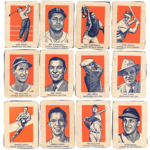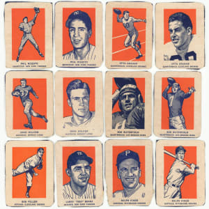 Support your favorite professional or amateur athlete with the offered 1952 Wheaties near complete set of (46/60) cards. This cereal issue was neatly extracted from period boxes and features captivating portraits and interesting action poses. The surfaces generally present in the (VG to EX) range and the blank backs are clean. Keys include: Berra (portrait), (2) Campanella, (2) Davies, G. Davis (portrait), Fears (portrait), Feller (action), (2) Graham, (2) Hogan, Kell (portrait), (2) Kiner, (2) Lemon, (2) Lujack, (2) Mikan, (2) Musial, (2) Pollard, (2) Rizzuto, (2) Snead, (2) D. Walker, (2) Waterfield and (2) T. Williams. Noted multiple cards of athletes feature both action and portrait poses.