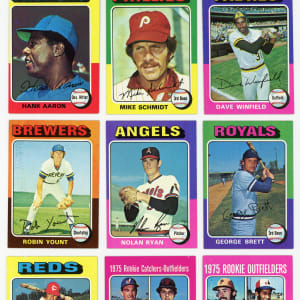 Featured is a 1975 Topps complete set of (660) cards. This very attractive edition generally averages (EX-MT) condition with some better or lesser. Keys include: #1 Aaron HL (VG), #61 Winfield (EX), #70 Schmidt (EX-MT), #223 Yount RC (EX), #228 Brett RC (VG-EX), #300 R. Jackson (EX-MT), #320 Rose (EX-MT), #500 Ryan (EX), #616 Rice RC (VG-EX), #620 Carter RC (EX-MT) and #660 Aaron (VG).