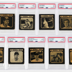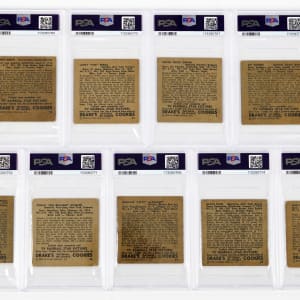 Each graded from GOOD 2 to VG+ 3.5 by PSA. Scarce 1950 Drake's Cookies starter set of (9) different cards featuring a three-bagger of Hall of Famers. Includes: PSA VG+ 3.5: #5 Snider; PSA GOOD+ 2.5: (4 cards) with #16 S. Gordon, #20 Dark, #24 Berra, #31 McDermott; PSA GOOD 2: (4 cards) with #13 Doerr, #18 Furillo, #23 Henrich and #35 Elliott.