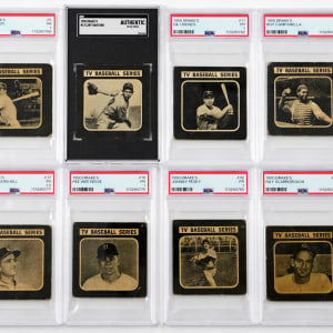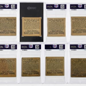 Each graded by either PSA or SGC. Tune in to the offered 1950 Drake's Cookies starter set of (8) different cards featuring (4) Brooklyn Dodgers Hall of Famers. Includes: PSA FAIR 1.5: #17 Marshall; PSA POOR 1: (6 cards) with #5 Snider, #6 Campanella, #11 Hodges, #19 Reese, #29 Scarborough, #32 Pesky and SGC Authentic: #2 Hartung (color added).
