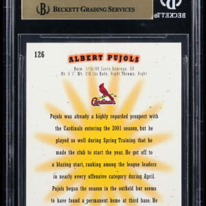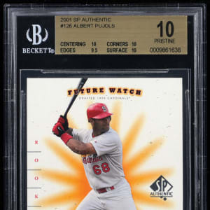 Graded PRISTINE 10 by BGS and serially numbered #0804/1250. As one of only two members of the 700 Home Run/3,000 Hit Clubs (Hank Aaron is the other), Cooperstown is in the near future for St. Louis Cardinals great Albert Pujols. As such, rookie material of "The Machine" is a sure-fire "blue chip" opportunity. Turn your bidding efforts toward the offered 2001 SP Authentic #126 rookie card with three 10 sub-grades! The overall condition breakdown is as follows: Centering: 10; Corners: 10; Edges: 9.5 and Surface: 10.