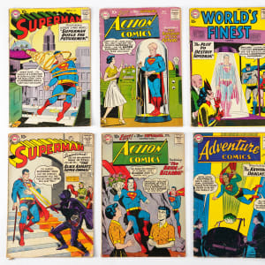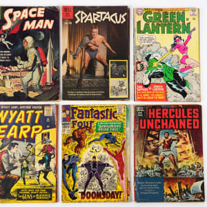 Super-Heroes and Westerners are the top attractions in this treasure chest selection of (77) 1950s-1960s comic books. A little more than 50% of these Golden/Silver Age comics were published by Dell. A half-dozen other publishers are represented, with DC being the next most populous, including (16) Superman related issues. Westerns are in ample supply, with the best featuring cover photographs of John Wayne, and Clint Eastwood. This well-read collection averages GD to VG, with several better, and several lesser.