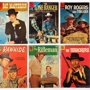 TV/Movie Westerns (22): The Searchers with John Wayne cover, The Comancheros, The Indian Fighter, Dragoon Wells Massacre, John Paul Jones, Roy Rogers (3), Rawhide with Clint Eastwood cover, The Lone Ranger, Bonanza, The Rifleman, Wagon Train (2), Gunsmoke, Bat Masterson, Tales of the Pony Express, Restless Gun, Annie Oakley, The Gray Ghost, Tales of Wells Fargo, Lawman;