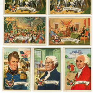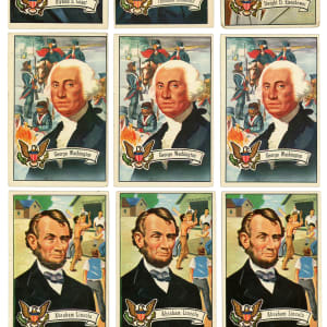 Cast the deciding vote to take home this 1956 Topps U.S. Presidents collection (112). This vintage non-sport series depicts our first thirty-three presidents in realistic illustrations, along with three cards commemorating important events from the Revolution and Federalist Era. The main attractions are a complete set (36/36); and a near-complete set (32/36). Also present are (44) duplicates, including card #1 Washington Takes Command, (2) #3 George Washington, and (2) #19 Abraham Lincoln. Condition is generally favorable, ranging (90% VG to EX+, 10% lesser).
