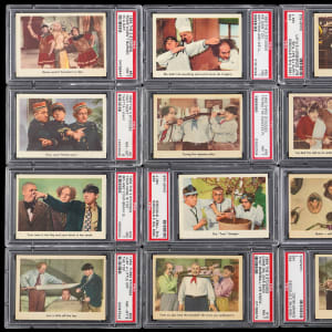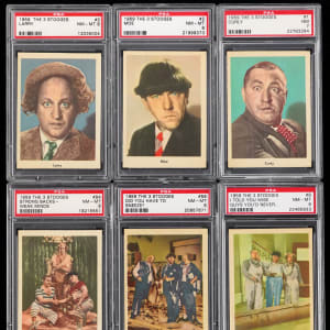One of the best postwar non-sport card issues makes a highly impressive appearance, with this 1959 Fleer The 3 Stooges complete PSA graded set (96). These classic cards are dressed for success in PSA holders, with grades of NM-MT 8, or NM 7 (no modifiers), including the key cards #1 Curly, #2 Moe, and #3 Larry. The Stooges were the absolute kings of slapstick comedy, and this 1959 Fleer set is formatted with colorized photographs of their mayhem and mirth, taken from their classic Columbia Pictures short films. Holding down the #26 spot on the PSA Set Registry, this nicely matched set boasts a GPA of 7.57, as the graded 8s hold a majority over the 7s. A want list topper for many collectors, these Stooges cards are vastly popular in any condition. The overall superior quality of this collection calls for eye gouging, head slapping or pie throwing in order to come out on top in the battle for this fantastic collecting prize.