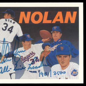 Serially numbered #1981/2500. Hall of Fame fireballer Nolan Ryan signed the offered 1991 Upper Deck Baseball Heroes #18 header card. The (NM-MT) single is penned in blue ink ("9") with an All-Time Leader inscription being added by the legend. Auction LOA from James Spence/JSA.