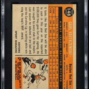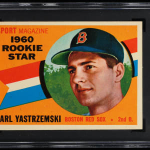 Graded NM 7 by SGC. Beantown faithful will want to seriously consider the offered 1960 Topps #148 Carl Yastrzemski rookie card. This horizontal jewel of the Boston Red Sox Hall of Famer flaunts four razor-sharp corners, creamy edges and radiant surface colors against a decorative "Sport Magazine 1960 Rookie Star" backdrop. A particularly attractive "Yaz" that ranks in the upper 10% of all similar copies judged by the grading service.