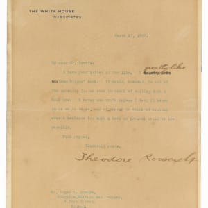 A Mt. Rushmore president is up for consideration, with this Theodore Roosevelt typed letter signed. Consistently ranked among the top five greatest American presidents, Roosevelt enjoys a consensus of being fourth best to have held our top political office. Dated 3/15/1907 on White House stationery, while Roosevelt was in office, this correspondence is addressed to Mr. Roger L. Scaife, of Houghton, Mifflin and Company. In the content, the 26th President regretfully declined an offer to write a book, stating "It would, however, be out of the question for me even to think about writing such a book now.". Roosevelt (d.1919) concluded this letter with a firm, prominent fountain pen signature, which retains a good degree of integrity, well over a hundred years later. He also crossed out a word or two and wrote in the words "greatly like" in the opening sentence. This once folded letter reports in attractive state, with a look of great period authenticity.