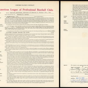 This “Uniform Players Contract - American League of Professional Baseball Clubs” signed by (2) Hall of Famers is between the Oakland Athletics and catcher Timothy K. Hosley and is in Excellent condition. It contracts Hosley for the 1973 season at the sum of $1800 per month. The last page of the four-page contract has been signed by the player and the A’s Charles O. Finley (“9-10) on the 9th of May 1973. The contract was approved on May 29th, 1973, and signed by the President of the American League, Joseph E. Cronin (“8-9”).