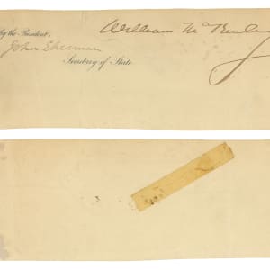America was robbed of an effective president, when William McKinley was assassinated in 1901, shortly into his second term. Add our 25th President to your collection, when you capture this 1897-1898 document cut dual-signed by McKinley, and Secretary of State John Sherman (d.1900). Sherman served in McKinley's cabinet from 3/6/1897-4/27/1898, dating the signatures to this 14-month window, during McKinley's first term. Sized at 8-1/2" x 3-1/8", this large cut is printed with "By the President", and "Secretary of State", indicating it was clipped from what was very likely an official document. A curved tear repaired with tape on the back, passes between the signatures of McKinley and Sherman, without affecting either one. Both signatures are attractive, and the cut is otherwise sturdy.