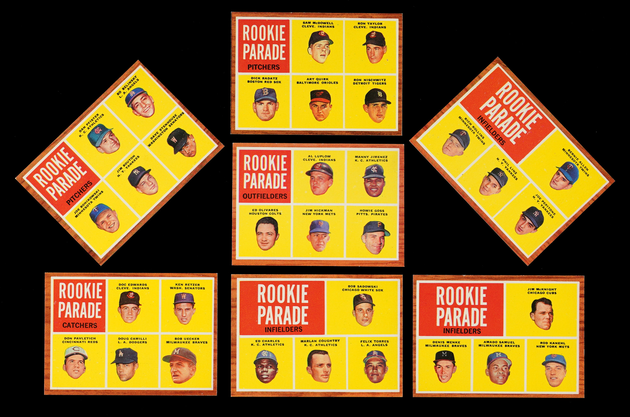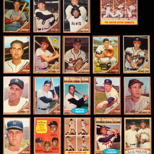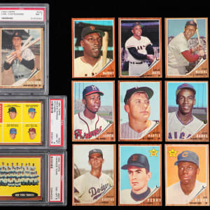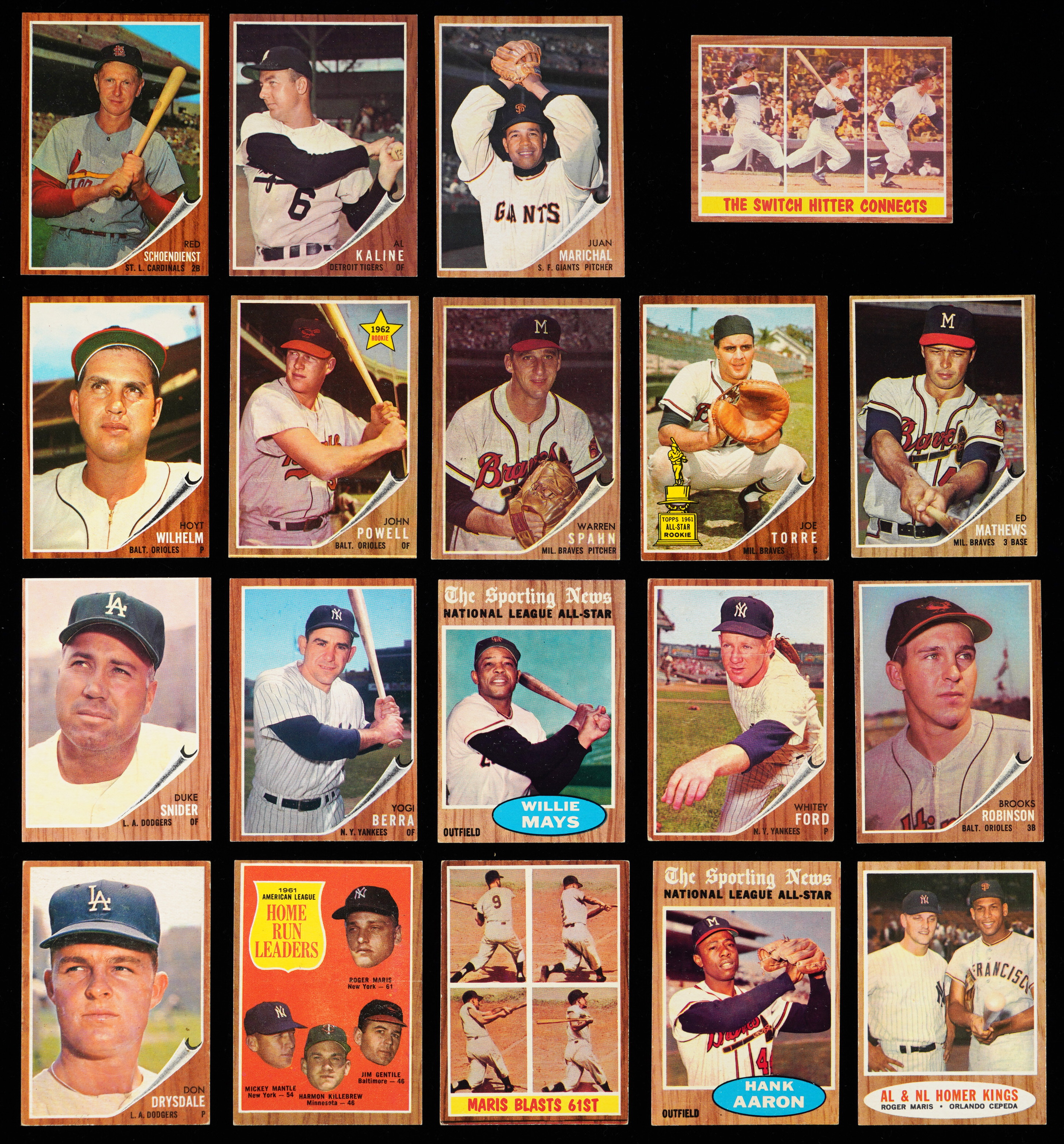 Superior 1962 Topps near complete set of 590/596 cards with a trio of PSA high-grade keys plus 18 variations. This crisp wood bordered edition has an approximate condition breakdown of 25% NM or better, 35% EX-MT, 25% EX and 15% VG-EX or lesser with the tougher high series generally presenting better than the more common numbers. Highlights include: #5 Koufax (EX), #25 Banks (EX), #30 Mathews (VG-EX), #45 B. Robinson (EX), #50 Musial (EX-MT), #53 Mantle/Maris/Killebrew HR LL (VG), #99 Powell RC (EX-MT), #100 Spahn (EX), #140 Ruth/Gehrig (EX-MT), #150 Kaline (EX), #199 Perry RC (EX), #200 Mantle (VG-EX), #218 Torre RC (VG-EX), #251 Yankees Team (PSA NM-MT 8), #300 Mays (GD), #310 Ford (VG-EX), #313 Maris IA (VG), #318 Mantle IA (EX-MT), #320 Aaron (VG), #340 Drysdale (VG-EX), #360 Berra (VG-EX), #387 Brock RC (VG-EX), #394 Aaron AS (EX), #395 Mays AS (VG-EX), #401 Maris/Cepeda (EX-MT), #425 Yastrzemski (PSA NM 7), #461 Hubbs RC (EX), #500 Snider (VG), #505 Marichal (EX), #544 McCovey (EX-MT), #545 Wilhelm (NM), #552 Cubs Team (NM), #575 Schoendienst (NM), #584 Twins Team (VG-EX), #591 McDowell RC (NM-MT), #592 Bouton RC (EX-MT), #593 Rookie Pitchers (PSA NM-MT 8), #594 Uecker RC (NM), #595 Rookie Infielders (NM), #596 Pepitone RC (NM), #597 Menke RC (NM-MT) and #598 Hickman RC (NM-MT). Also present are 18 green tint/checklist variations including #22, 98, 106, 113, 120, #129 Walls (EX, Pinstriped Jersey), 135-137, 152, 172, 178, 184, 192, 277, 367, 441 and 516 (average VG-EX, all six extra checklists are marked, but those checklists within the set are clean and unmarked). Missing only #1 Maris, #10 Clemente, #18 Mantle/Mays, #350 F. Robinson, #471 Mantle AS and #530 Gibson for completion.