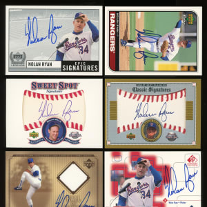 K-master Nolan Ryan fires away with these six 1998-2002 Upper Deck Nolan Ryan certified autograph cards. The following "on card" signatures are present: 1998 Upper Deck Retro Sign of the Times, 1999 SP Signature Edition, 1999 Upper Deck Century Legends Epic Signatures, 2001 Upper Deck Hall of Famers Jerseys, 2001 Sweet Spot Signatures and 2002 Sweet Spot Classics Signatures.