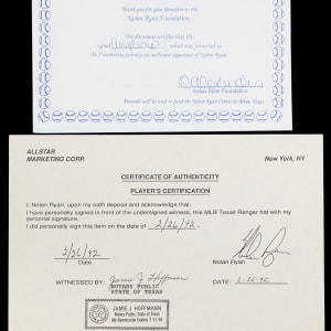 Texas Rangers size 7 ½, signed on the brim. Comes with a notarized “Player Certification” declaring that he personally signed in front of a witness on 2/26/92 and the Cert is also signed by Nolan Ryan.