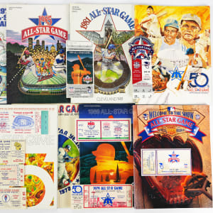 Strikeout King Nolan Ryan made eight trips to the All-Star game. In 1995, after his retirement, he returned to throw out the first pitch and was named the A.L. Captain for the day. This group has an All-Star game program from all nine years that he was there. They are all in superior EX-MT to NR-MT condition and include: 1972, 1973, 1975, 1977, 1979 (50th AS game), 1981, 1985, 1989, 1995 (double size).