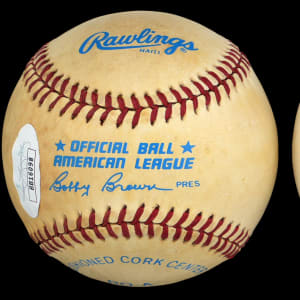 Possibly the two greatest players of their time, Joe DiMaggio and Ted Williams have teamed up to each sign one of these OAL/Bobby Brown baseballs with large (“8-9”) signatures. The DiMaggio signed ball is creamy toned, while Ted Williams has signed a nice white example.