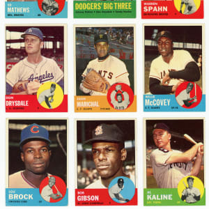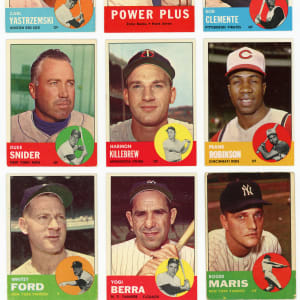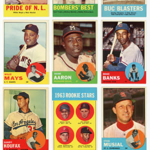 Premier 1963 Topps near set of 574/576 cards plus a pair of variations. This colorful assembly has an approximate condition breakdown of 20% EX-MT or better, 30% EX, 25% VG-EX and 25% VG or lesser with the tougher high series generally presenting on level with the lower numbers. The lower end of the condition spectrum is primarily due to factory errant centering common to the issue. Highlights include: #1 Aaron/Musial/F. Robinson LL (VG), #2 Mantle/Runnels LL (EX), #3 Aaron/Banks/Mays LL (VG), #18 Buc Blasters/Clemente (EX-MT), #25 Kaline (EX), #115 Yastrzemski (VG), #120 Maris (FR), #138 Mays/Musial (EX-MT), #173 Mantle/Richardson/Tresh (VG), #210 Koufax (VG-EX), #228 Oliva RC (VG-EX), #242 Aaron/Banks (EX-MT), #247 Yankees Team (EX-MT), #250 Musial (EX-MT), #275 Mathews (EX-MT), #300 Mays (VG-EX), #320 Spahn (EX), #340 Berra (EX-MT), #345 B. Robinson (trimmed), #360 Drysdale (VG-EX), #380 Banks (EX-MT), #390 Aaron (EX-MT), #400 F. Robinson (EX), #412 Drysdale/Koufax/Podres (VG-EX), #415 Gibson (EX-MT), #440 Marichal (VG), #446 Ford (VG), #466 Freehan RC (VG-EX), #470 Tresh (EX), #472 Brock (GD), #473 Mets Team (VG-EX), #490 McCovey (EX), #500 Killebrew (EX-MT), #525 Fox (VG-EX), #540 Clemente (trimmed), #544 Staub RC (EX-MT), #550 Snider (VG), #552 Tigers Team (EX) and #553 Stargell RC (trimmed). Also present are both 1962/1963 Rookie Stars variations for cards #29 and 54 (average VG-EX) plus an “original reprint” #537 Rose RC counterfeit (NM). Missing only #200 Mantle and #537 Rose RC for completion.
