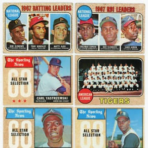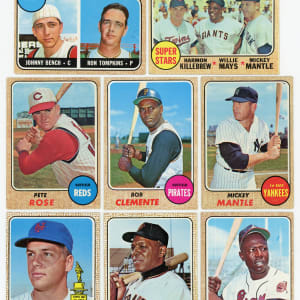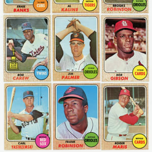 Presented is a 1968 Topps near complete set of 597/598 cards. This “collector’s grade” assembly has an overall approximate condition breakdown of 10% EX or better, 30% VG-EX, 35% VG and 25% GD or lesser. Highlights include: #1 Clemente/Alou LL (GD), #3 Clemente/Aaron LL (FR), #20 B. Robinson (EX), #45 Seaver (VG-EX), #50 Mays (GD), #80 Carew (VG-EX), #100 Gibson (VG), #110 Aaron (VG-EX), #150 Clemente (EX), #230 Rose (VG), #240 Kaline (VG-EX), #247 Bench RC (GD), #250 Yastrzemski (VG-EX), #280 Mantle (FR), #330 Maris (GD), #355 Banks (VG), #369 Yastrzemski AS (GD), #370 Aaron AS (GD), #374 Clemente AS (VG-EX), #408 Carlton (VG-EX), #480 Managers’ Dream/Clemente (VG-EX), #490 Super Stars Mantle/Mays (VG), #500 F. Robinson (VG-EX), #520 Brock (VG-EX), #528 Tigers Team (EX), #530 Bird Belters/Robinsons (VG) and #575 Palmer (EX-MT). Missing only #177 Ryan RC for completion.