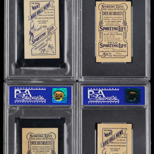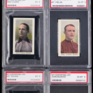 Each graded either EX 5 or EX-MT 6 by PSA. Take a trip around the diamond with these (4) 1910-1911 M116 Sporting Life singles. Includes: PSA EX-MT 6: (2 cards) with McGraw, Phelan (only 3 higher); PSA EX 5: (2 cards) with Clarke and A. Wilson. Part of a larger 1910-1911 M116 Sporting Life near set break available throughout this auction.