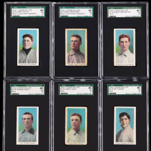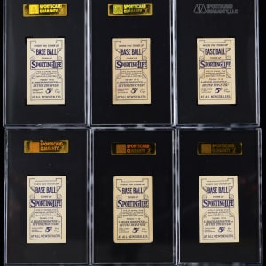Each graded VG 3 by SGC. Score the offered six-pack of 1910-1911 M116 Sporting Life Blue Background group of (6) different cards. Includes: Bresnahan, Crawford (Lionel Carter Collection), H. Davis, L. Doyle (Lionel Carter Collection), Leach (cracked flip) and I. Thomas. Part of a larger 1910-1911 M116 Sporting Life near set break available throughout this auction.