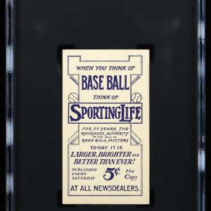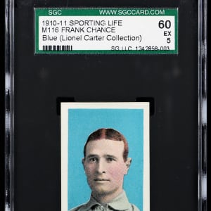 Graded EX 5 by SGC. The third component of "baseball's sad lexicon" is confirmed with the offered 1910-1911 Sporting Life Frank Chance (Blue Background) version. This handsome portrayal of the capless Chicago Cubs Hall of Famer presents at the absolute tip-top of its overall assessment. Lionel Carter Collection flip provenance. Part of a larger 1910-1911 M116 Sporting Life near set break available throughout this auction.