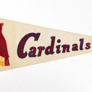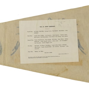 The 1961 St. Louis Cardinals were not a great team, they finished fifth, but they did have some great players including Stan Musial, Bob Gibson, Curt Simmons Red Schoendienst, Bill White, Curt Flood and Ken Boyer. This photo-pennant from that year features them all and is in Very Good condition with only one set of tassels. The photo is still in nice shape. The back of the pennant features a key to the players in the photo listed by row.