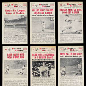 Foundational figures of our national pastime are chronicled with the offered 1960 Nu-Card Baseball Hi-Lites complete set of (72) cards. These postcard-sized artifacts generally present in the (EX-MT to NM) range and are fashioned after newspaper articles of the day. The reverses display varying degrees of age-induced foxing. Highlights include: #1 Babe Three Homers (EX, stain), #7 DiMag Comes Thru (EX-MT), #16 Ruth Called Shot (NM), #22 Mantle HR (NM), #24 Gehrig Streak (NM), #27 Mays Catch (EX-MT), #38 DiMaggio Streak (EX-MT, stain), #39 Williams .406 (EX-MT), #47 Ruth HR (EX-MT), #50 Mantle Stadium (EX-MT), #52 T. Williams Hero (NM) and #53 J. Robinson Playoffs (EX-MT).