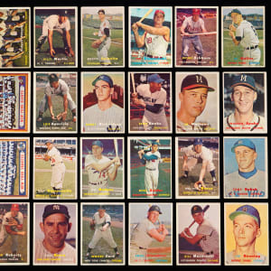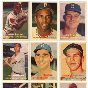 Essential 1957 Topps near set of 406/407 cards. This inaugural standard-sized edition has an approximate condition breakdown of 10% EX or better, 25% VG-EX, 35% VG and 30% GD or lesser with the tougher fourth series generally presenting on level with the more available numbers. Highlights include: #1 T. Williams (VG-EX), #2 Berra (VG), #7 Aparicio (VG-EX), #10 Mays (VG), #15 Roberts (VG), #18 Drysdale RC (VG), #20 Aaron (VG), #24 Mazeroski RC (VG), #25 Ford (VG), #30 Reese (VG-EX), #35 F. Robinson RC (GD), #55 Banks (EX), #62 B. Martin (VG), #70 Ashburn (EX), #76 Clemente (VG), #80 Hodges (VG-EX), #85 Doby (VG), #90 Spahn (GD), #97 Yankees Team (VG-EX), #125 Kaline (GD), #165 Kluszewski (VG), #170 Snider (VG), #210 Campanella (FR, reverse pen mark), #212 Colavito RC (GD), #215 Slaughter (VG), #250 Mathews (VG), #286 Richardson RC (VG-EX), #302 Koufax (GD), #312 Kubek RC (VG), #317 Giants Team (GD), #322 Reds Team (GD), #324 Dodgers Team (GD), #328 B. Robinson RC (VG), #338 Bunning RC (VG), #400 Dodgers’ Sluggers (GD) and #407 Mantle/Berra (VG-EX). Missing only #95 Mantle for completion.