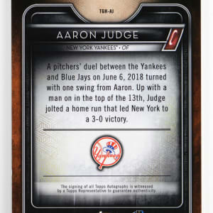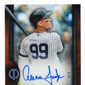 Serially numbered #1/1. One-of-a-kind 2020 Topps Tribute Aaron Judge certified autograph. Seeded 1:1013 packs for any player across the high-end release's production line, this "on card" black parallel signature of the New York Yankees slugger is simply breathtaking. Among the best modern inserts that any #99 player collector's could hope for!
