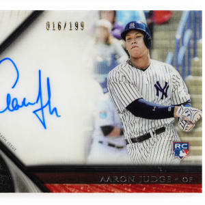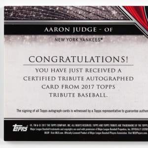 Serially numbered #016/199. Triumphant 2017 Topps Tribute Aaron Judge certified autograph rookie card. A flawless "on card" signature of the New York Yankees slugger that is poised to surge in value!