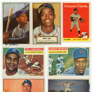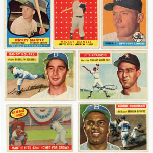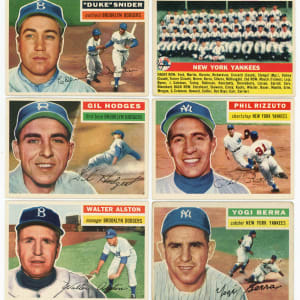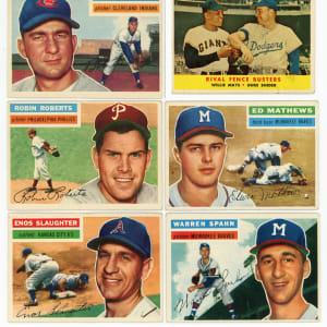 1956 Topps: (59 cards, average GD to VG) with #8 Alston (EX), #10 Spahn (VG), #15 Banks (VG-EX), #30 J. Robinson (GD), #79 Koufax (VG, stain), #101 Campanella (VG-EX), #107 Mathews (VG), #109 Slaughter (VG), #110 Berra (FR), #113 Rizzuto (EX), #140 Score RC (EX-MT), #145 Hodges (VG-EX), #150 Snider (VG), #166 Dodgers Team (VG), #180 Roberts (VG-EX), #200 Feller (GD), #226 Giants Team (VG), #240 Ford (FR), #251 Yankees Team (GD, stain), #255 Lemon (VG-EX), #292 Aparicio RC (VG-EX);