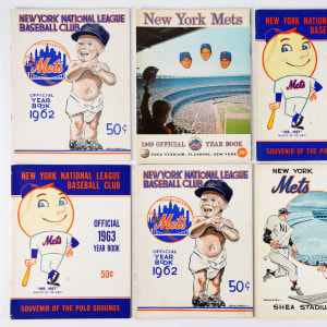 New York Mets fans find plenty to cheer about with this 1962-2014 Mets yearbook collection (86). This nicely curated collection is attractive throughout, ranging (80% EX-MT to NM-MT, 20% VG-EX to EX). Starting with (2/4) possible 1962 inaugural season editions, this comprehensive collection boasts a complete 53-year run, with at least one edition for each year spanning the period 1962-2014. In addition to the (2) first year editions, this selection is also highlighted by the 1969 and 1986 World Series championship seasons, the 1973 and 2000 National League championship seasons, and a rare 1974 edition with a spelling error on the front cover. Also in the mix are numerous revised editions, and several Spanish language editions. An outstanding representation of the Mets first 53 seasons, this lovingly assembled collection seeks a new owner to continue the tradition.