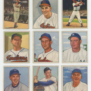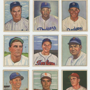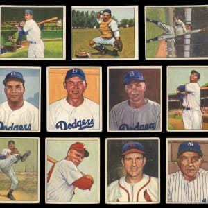 Pint-sized but powerful 1950 Bowman near set of 251 of 252 cards. The colorful illustrations have an approximate condition breakdown of 20% VG-EX or better, 25% VG, 35% (GD) and 20% FR or lesser with the tougher first series generally presenting on level with the more common numbers. Highlights include: #1 Parnell RC (FR), #6 Feller (PR), #8 Kell (VG), #11 Rizzuto (GD), #19 Spahn (GD), #21 Reese (GD), #23 Newcombe RC (VG), #32 Roberts (VG), #33 Kiner (GD), #35 Slaughter (GD), #39 Doby (VG), #46 Berra (VG), #49 Lemon (VG), #58 Furillo (VG), #62 Kluszewski (FR), #75 Campanella (GD), #77 Snider (VG), #84 Ashburn (GD), #94 Boudreau (GD), #98 T. Williams (FR), #112 Hodges (VG), #139 Mize (VG-EX), #148 Wynn (VG), #217 Stengel (VG-EX), #219 Bauer RC (VG-EX), #220 Durocher (VG), #226 Konstanty RC (VG-EX), #229 Frisch (VG), #232 Rosen RC (VG-EX) and #252 DeMars RC (VG). Missing only #22 J. Robinson for completion.