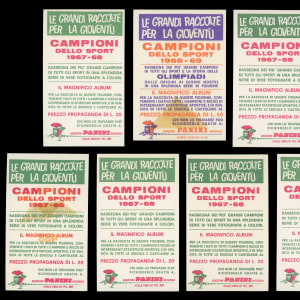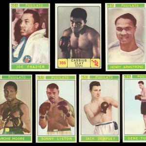 The future Muhammad Ali and other former American Heavyweight Champs put on the gloves for these seven 1967-1969 Panini Campioni Dello Sport Boxing singles. Released during an era where few boxing cards were produced, this Italian issue features only "the best of the best!" Includes: 1967-1968 Panini Campioni Dello Sport: (6 cards) with #455 Liston (EX-MT), #464 Frazier (EX), #483 Dempsey (EX-MT), #484 Tunney (EX), #485 H. Armstrong (EX-MT), #488 A. Moore (FR, reverse residue) and 1968-1969 Panini Campioni Dello Sport: #308 Clay (FR, reverse residue).