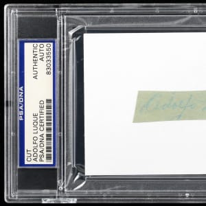 Catch a considerably tough signature, with this Dolf Luque cut. A longtime pitcher with the Cincinnati Reds, Luque was on the winning side in the 1919 "Black Sox" World Series. He also picked up a second World Series ring in 1933, with the New York Giants. Baseball historians will appreciate the Cuban native's status as the first Latin American pitcher to play in the Majors. The offered cut measures 2-3/4" x 1/2", and is adhered to an index card. Applied as "Adolfo Lugue", this signature is somewhat faded, however it remains clearly recognizable. Upon his retirement from Major League Baseball, Lugue returned to Cuba, where he spent the rest of his days as a manager, and occasional pitcher, in the Cuban, Mexican, Florida International, and Southwest International leagues, remaining in uniform until a year before his death in 1957. PSA/DNA has encapsulated this cut, with an Authentic Auto designation.