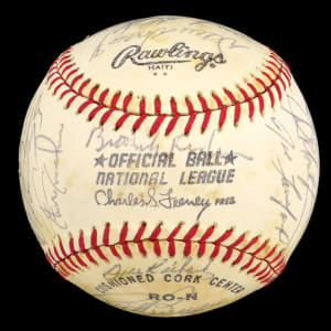 This mildly toned ONL/Feeney baseball has been signed by (27) members of the 1982 San Diego Padres including 15-time All-Star and Hall of Famer, Tony Gwynn. He was a rookie, just beginning his unmatchable career. Other notable signers include Dick Williams (sweet spot), Eric Show, Gary Templeton and Bob Tolan. Signatures average (“7 to 9”).