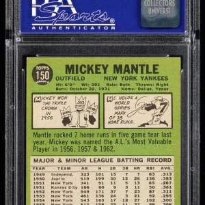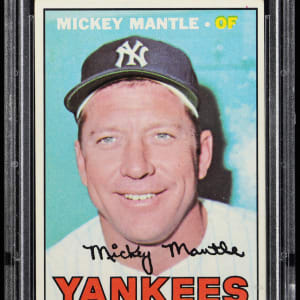 Graded EX-MT 6 by PSA. Fresh 1967 Topps #150 Mickey Mantle picturing the New York Yankees Hall of Famer during the later stages of his prolific career.