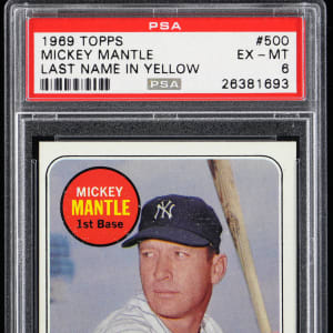 Graded EX-MT 6 by PSA. This swan song of Mickey Mantle"s storied career is a "Last Name in Yellow" variation. New York Yankees Hall of Famer.
