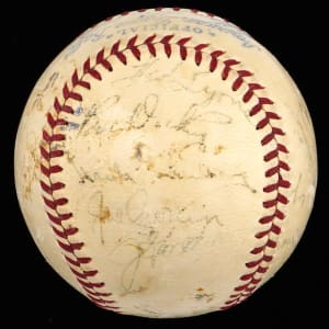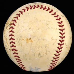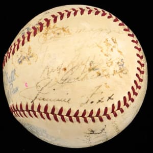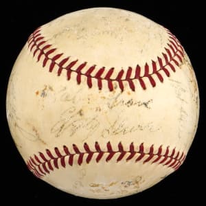 It was a lucky 7th playing of the All-Star Game for the American Leaguers, when they participated in the period signing of the offered OAL/Harridge baseball. The AL squad came out on top of a tight contest, winning by a score of 3-1. The venue turned out to be even luckier for the hometown crowd, as Yankee Stadium hosted both the All-Star Game, and the World Series in 1939. The Yankees stars performed admirably in both of these main stage events, sweeping the World Series, and collecting half of the AL squad's six hits in the Mid-Summer Classic, including a 5th inning home run by Joe DiMaggio. While time has taken its toll on the (21) signatures covering the offered baseball, fortune has smiled on some of the biggest stars. The Jimmie Foxx signature stands out as the most distinct example, and those of Bill Dickey, Hank Greenberg, and Joe DiMaggio are easy to spot.
