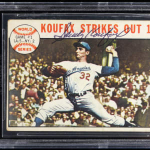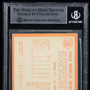 Signature judged Authentic by Beckett Authentic and encapsulated. Los Angeles Dodgers Hall of Fame ace Sandy Koufax dominates when it matters most on the offered 1964 Topps #136 World Series Game 1 Strikes Out 15 autographed card. The blue ink endorsement grades a strong ("8") and is placed on a (VG) surface.