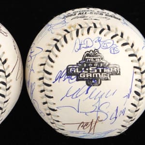 "This time it counts", was the tagline for the first ever MLB All-Star Game to determine home field advantage in the World Series. Revisit this historic Mid-Summer Classic, with these (2) baseballs team-signed by the 2003 American League and National League All-Stars. By our count, these 2003 Official All-Star Game baseballs host a combined total of (59) signatures, with plenty of big names noted. The autographs are generally sharp, and the bright white balls are attractive, though the factory labeling stamps show moderate fading.