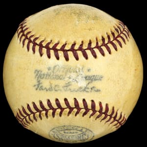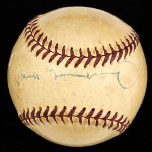 Make small ball your game with this Hank Greenberg signed ONL/Frick mini-baseball. A towering giant for his day at 6'3" tall, Greenberg was one of the premier sluggers of the 1930s-1940s, and he may have reached the 500 home run plateau had he not missed nearly four full seasons to WWII military service. Greenberg has signed this shellacked mini-baseball on the sweet spot, and his signature projects "6" strength. Examination under an x-ray machine has revealed there is a second signature located on this ball, however it is not visible to the naked eye.