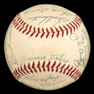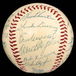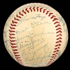 A Baltimore syndicate purchased the St. Louis Browns at the end of 1953, and the Baltimore Orioles were born. This is a very nice example of a 1954 team-signed ball from the Orioles’ inaugural season. This creamy OAL/Harridge baseball has been signed by (28) members of that team (“7 to 9”).